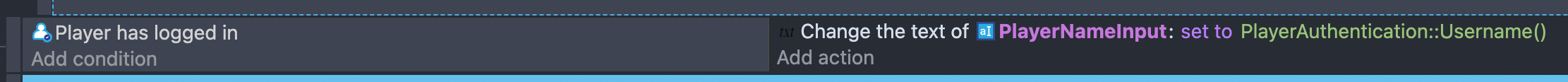 In certain cases, you'll want to know exactly when the user has logged in, so you can greet them with a welcome message, or save their username in the variables. This is particularly useful to implement to handle when a player logs in to a different account, as the condition "Player is authenticated" will always stay true, whereas the condition "Player has logged in" will become true only for a single frame.